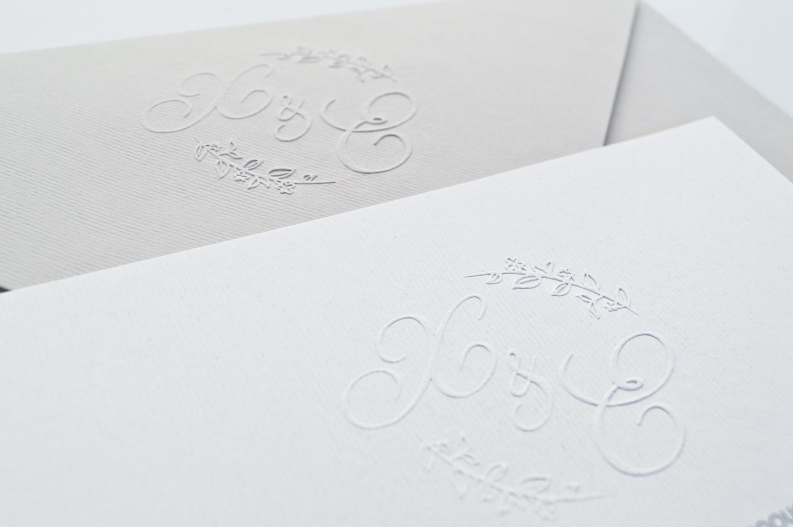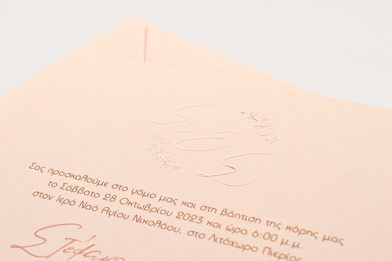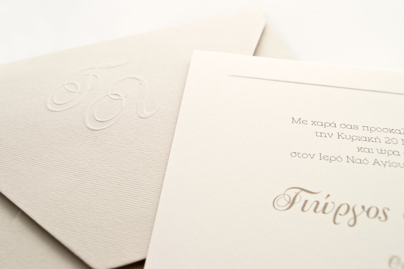 Προσκλητήριο Γάμου: Λεπτομέρεια μονογράμματα βαθυτυπία (letterpress) χωρίς χρώμα σε Φάκελο γραμμωτό υπόλευκο_Κωδικός 5955