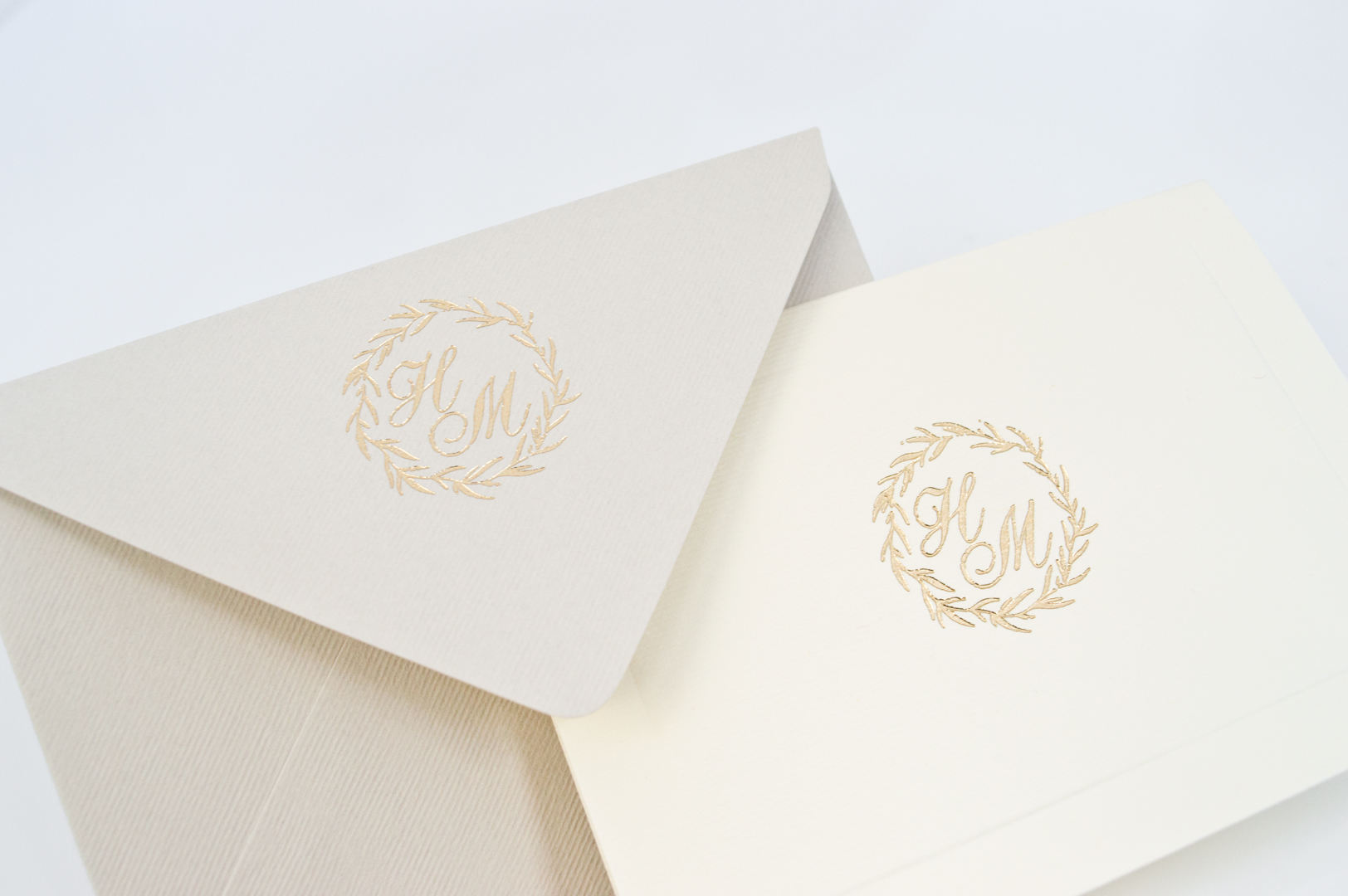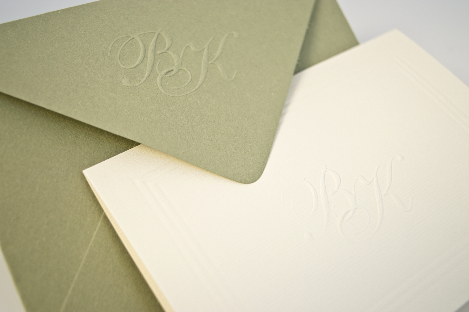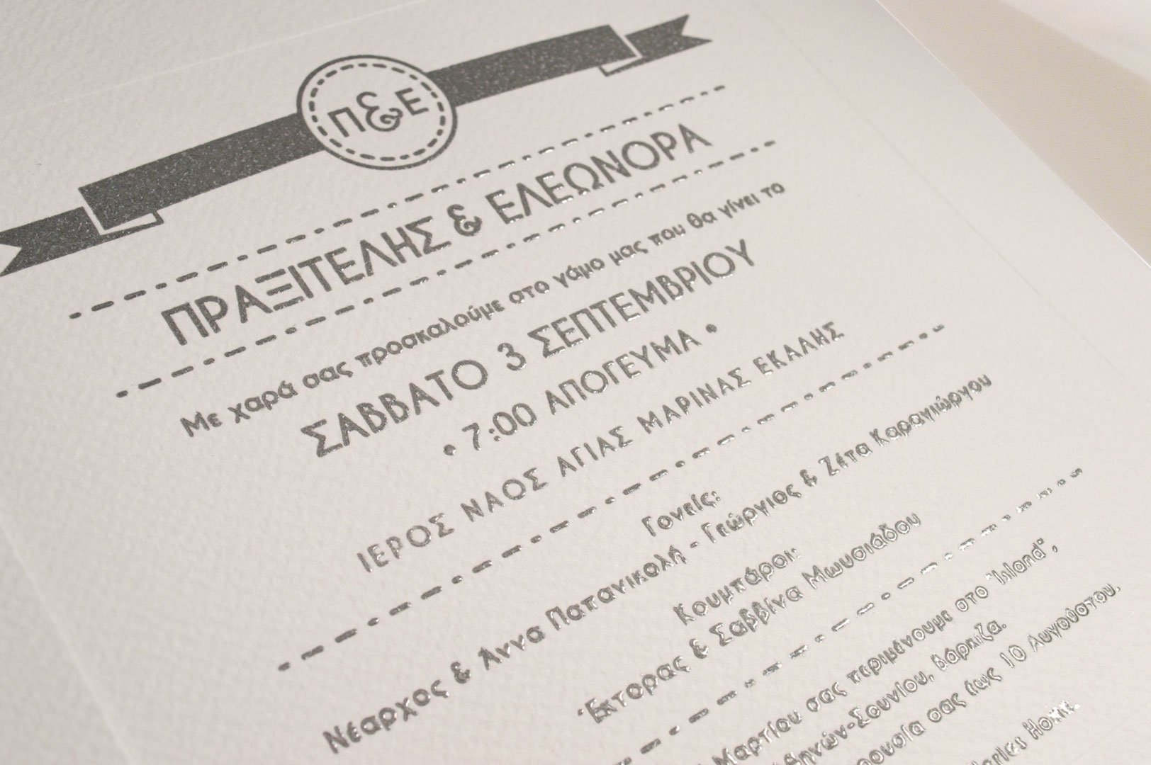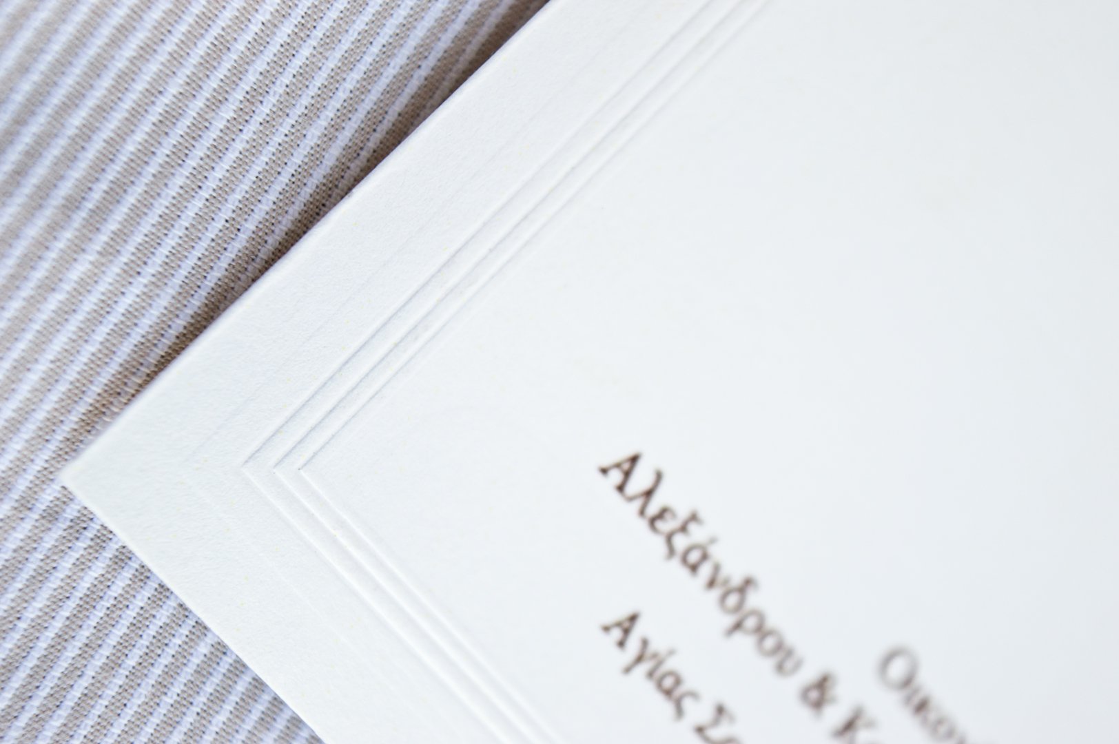 Προσκλητήριο Γάμου: Λεπτομέρεια μονογράμματα βαθυτυπία (letterpress) χωρίς χρώμα σε Φάκελο γραμμωτό υπόλευκο_Κωδικός 5955