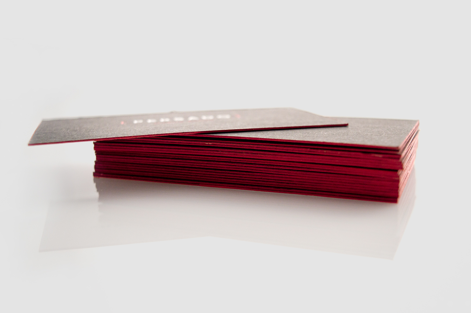 Σόκορο (edge-printing) πορτοκαλί και κόκκινο σε επαγγελματική κάρτα (business card) σε μαύρο χαρτί