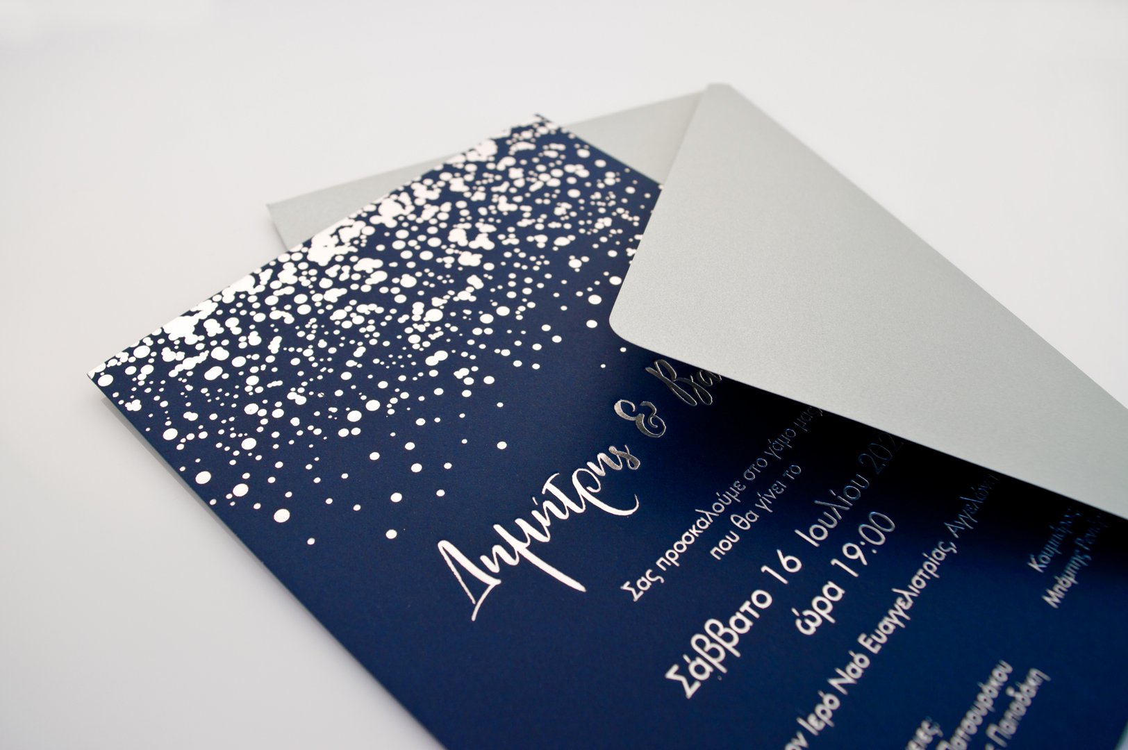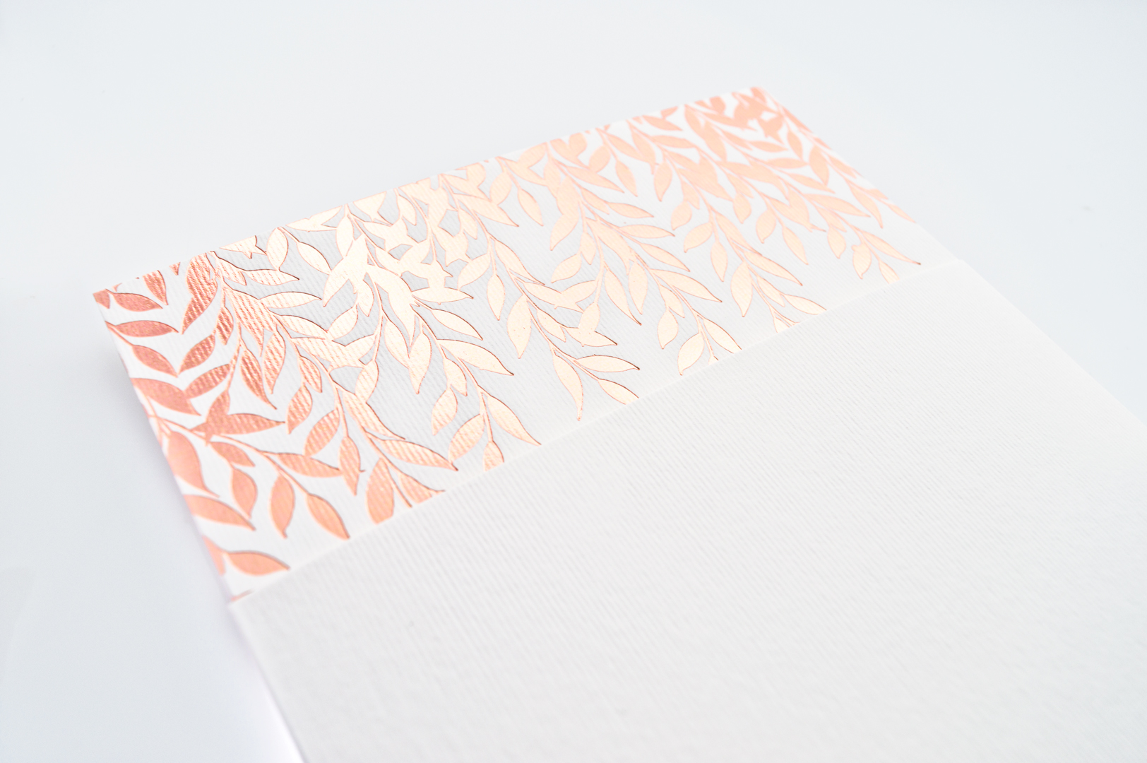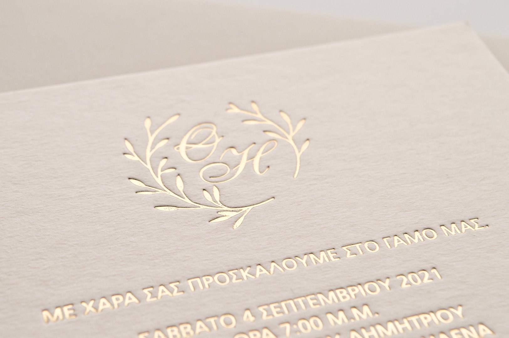Λεπτομέρεια Προσκλητηρίου: Κάρτα σε χαρτί βαμβακερό λευκό 1000 γραμ. με εκτύπωση βαθυτυπία (letterpress) σε α) θερμοτυπία μαύρο και ροζ χρυσό και θέμα φύλλα_Κωδικός ΓΝΣ 3035, β) θερμοτυπία navy blue και χρυσό και θέμα φύλλα_Κωδικός ΓΝΣ 3034, γ) θερμοτυπία μαύρο και ασημί και θέμα φύλλα_Κωδικός ΓΝΣ 3033