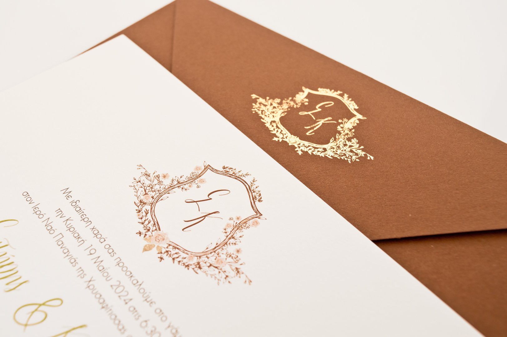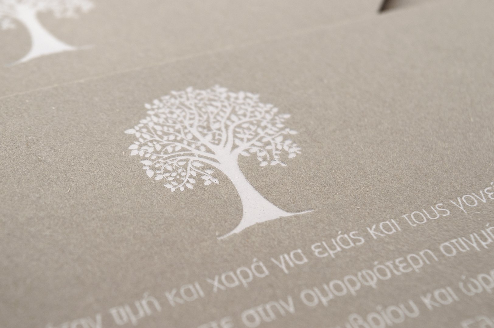 Προσκλητήριο Γάμου: Λεπτομέρεια Κάρτας σε χαρτί καφέ ανακυκλωμένο 800 γραμ. με εκτύπωση βαθυτυπία (letterpress) & λευκοτυπία_Κωδικός 5916
