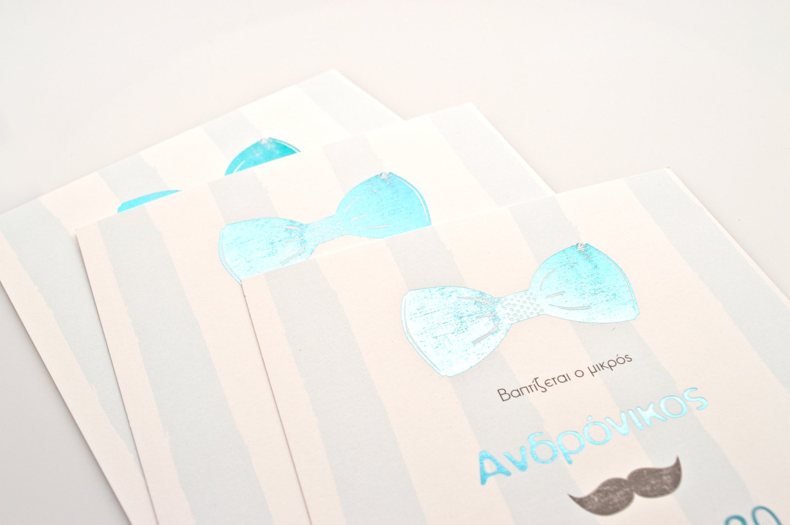 Λεπτομέρεια Σόκορο (edge-printing) γαλάζιο σε κάρτα από βαμβακόχαρτο με βαθυτυπία (letterpress) και θερμοτυπία (foil) γκρι και γαλάζιο