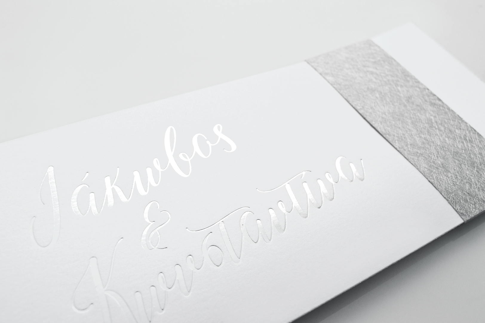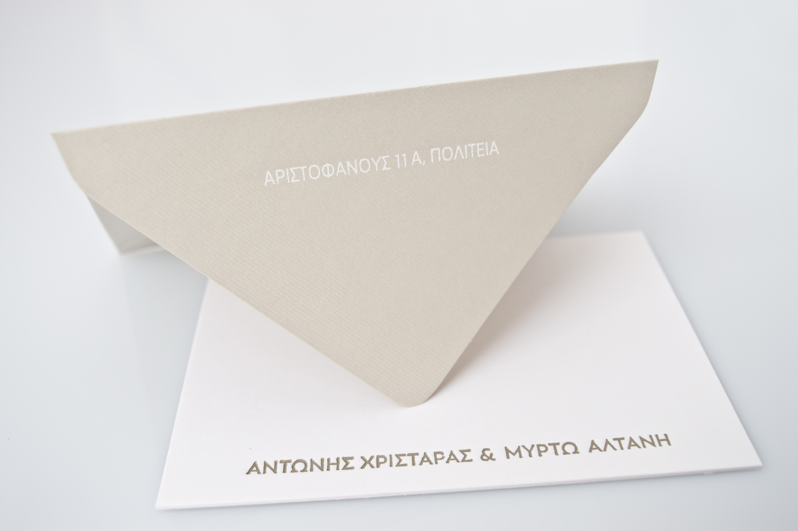 Λεπτομέρεια Προσκλητηρίου Γάμου: Φάκελος διάστασης 16x22 εκατ. σε χαρτί οικολογικό nude180 γραμ. και Κάρτα σε χαρτί περλέ/μεταλλιζέ λείο λευκό 250 γραμ. με εκτύπωση μελάνι γκρι και ανάγλυφη εκτύπωση ονομάτων ζευγαριού σε nude μελάνι_Κωδικός ΓΕΠ 0060