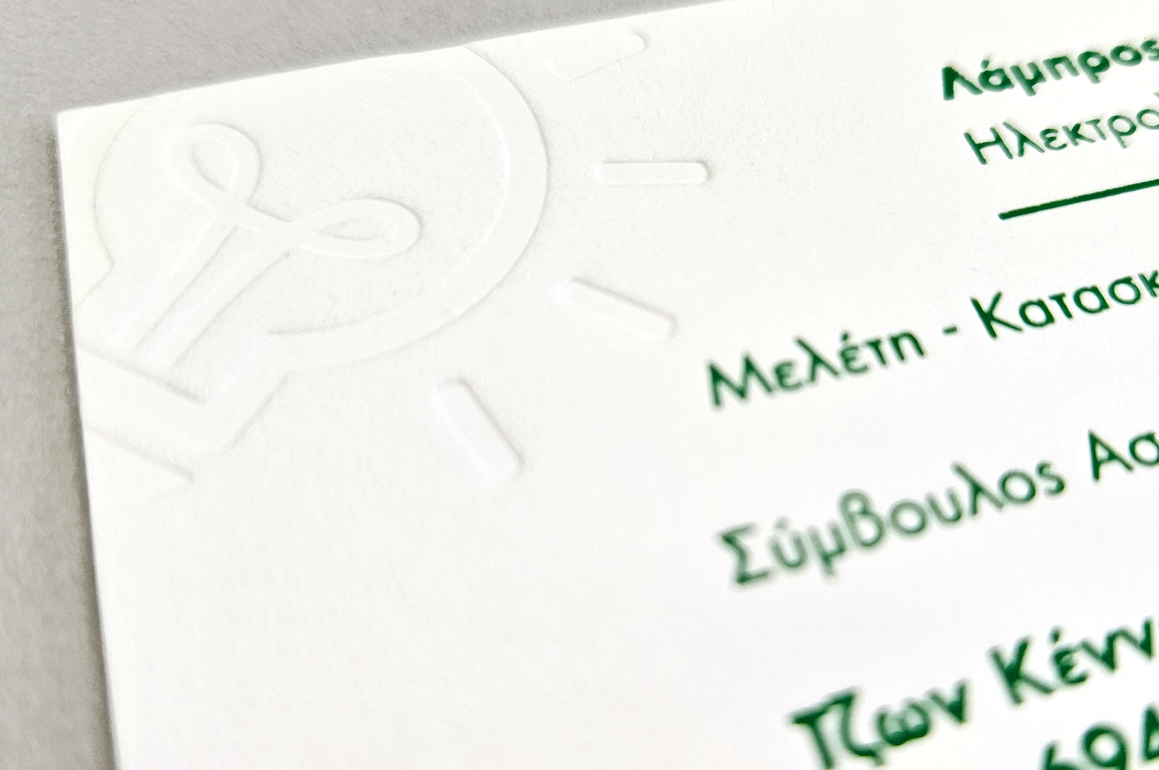 Η μέθοδος της βαθυτυπίας (letterpress/debossing) αποτελεί μία εκλεπτυσμένη μέθοδο διαμόρφωσης του χαρτιού, κατά την οποία το σχέδιο «βυθίζεται» στην επιφάνειά του, δημιουργώντας ένα κομψό ανάγλυφο προς τα μέσα. Μπορεί να εφαρμοστεί είτε χωρίς μελάνι, αξιοποιώντας το παιχνίδι φωτός και σκιάς, είτε σε συνδυασμό με μελάνι ή ταινία θερμοτυπίας (foil), προσδίδοντας ακόμη πιο εντυπωσιακό και πολυτελές αποτέλεσμα. Χρησιμοποιείται συχνά σε επαγγελματικές κάρτες, εξώφυλλα και premium εταιρικά έντυπα. Η ιδιαίτερη υφή ενισχύει την αίσθηση ποιότητας και διαφοροποιεί το έντυπο. Αποτελεί ιδανική επιλογή για minimal αλλά και υψηλής αισθητικής εφαρμογές.